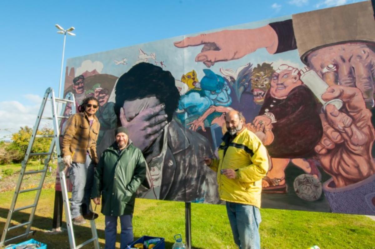 Artistas locales, convocados por la Subsecretaría de Derechos Humanos, trabajan en un mural conmemorativo al 24 de marzo en la Plaza de la Memoria, Verdad y Justicia.