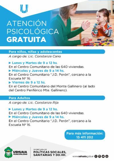 La Municipalidad de Ushuaia pone a disposición de la comunidad un nuevo servicio que será brindado en centros comunitarios de la ciudad. El mismo consiste en atención psicológica y estará a cargo de las Licenciadas Cano y Rija, para la atención especializada en niños, niñas, adolescentes y adultos.