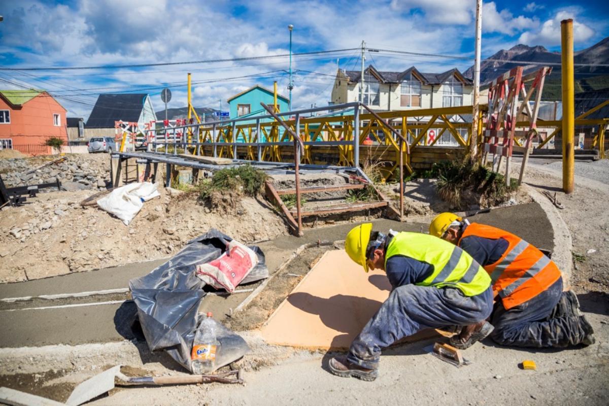 Se construyen las veredas en la plaza Gaucho Rivero, avanzando en la intervención sobre el espacio público en la extensión que va desde Tekenika hasta Fuegia Basket, sobre la calle Damiana Fique.