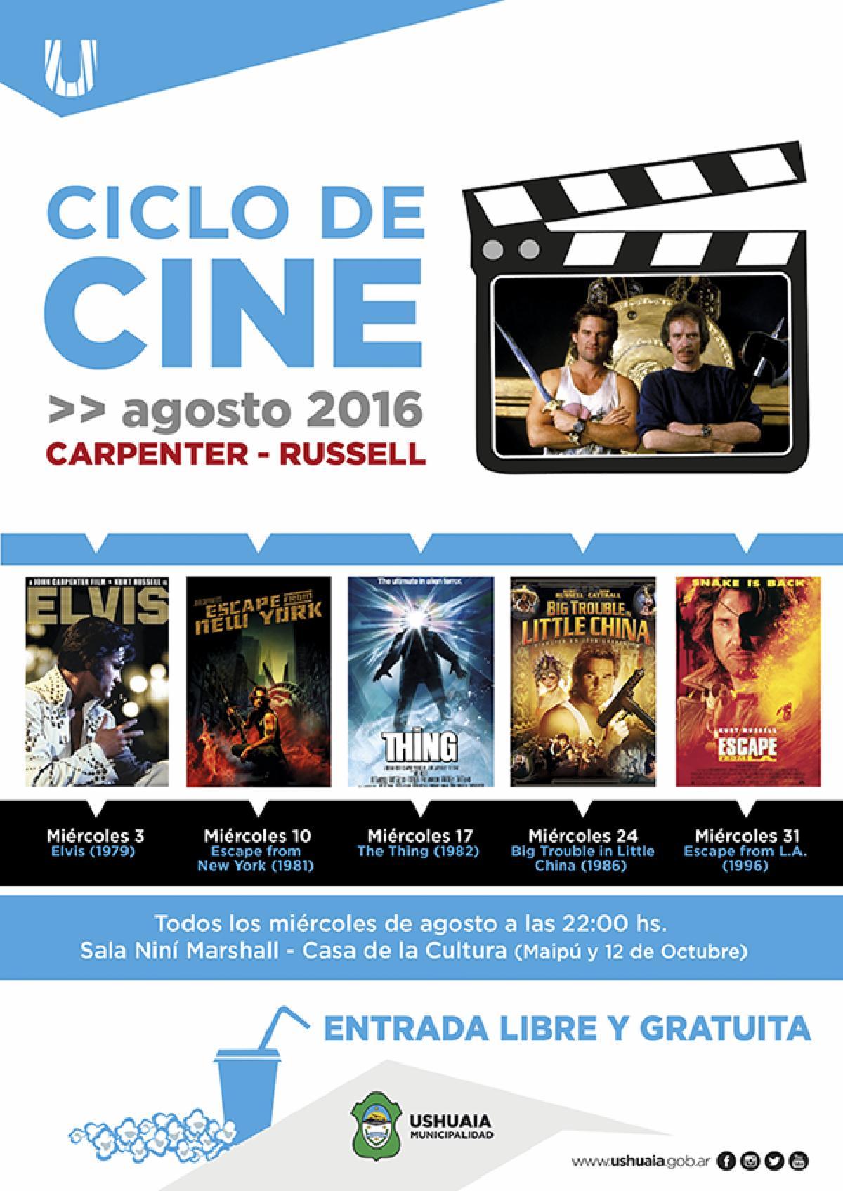 El próximo miércoles 3 de agosto iniciará la proyección de una nueva serie de películas dentro del habitual ciclo de cine de la Municipalidad de Ushuaia. En esta oportunidad se proyectarán 5 films todos los miércoles del mes, bajo la temática "John Carpenter & Kurt Russell ", en la Sala Niní Marshall de la Casa de la Cultura a partir de las 22 hs.