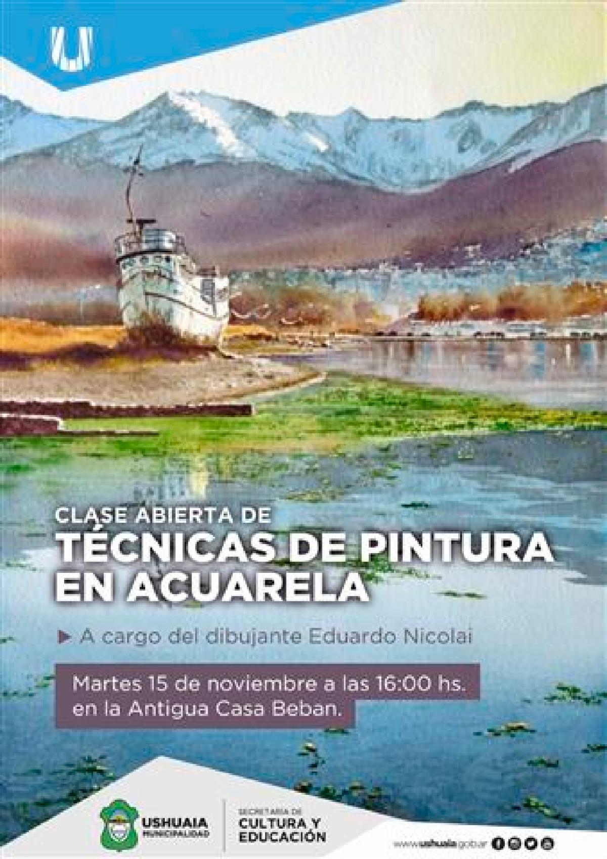 La Dirección de Coordinación Cultural y Gestión del Patrimonio junto al artista Eduardo Nicolai invitan a toda la comunidad a participar de la clase abierta sobre técnicas en acuarelas a llevarse a cabo este martes 15 de noviembre a las 16 horas en la Antigua Casa Beban. En la oportunidad se explicará la técnica de pintura en acuarela, y se pondrán como ejemplos demostrativos paisajes de nuestra ciudad.