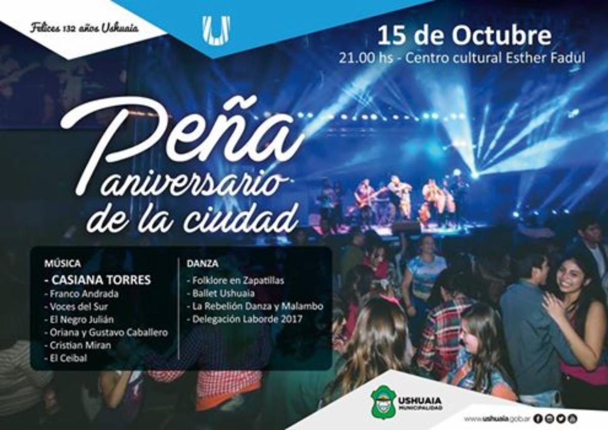 Se invita a toda la comunidad a compartir juntos el cumpleaños de la ciudad, viviendo una noche a puro folclore. En el encuentro se podrá disfrutar de grupos artísticos musicales y de danzas y también el público será protagonista, ya que se podrán bailar todas las danzas populares de nuestra región. Participarán de la Peña Casiana Torres, Franco Andrada, Voces del Sur, el Negro Julián, Oriana y Gustavo Caballero, Cristian Miran y El Ceibal. En danzas se presentarán Folklore en Zapatillas, Ballet Ushuaia, La Rebelión Danza y Malambo y Delegación Laborde 2017.