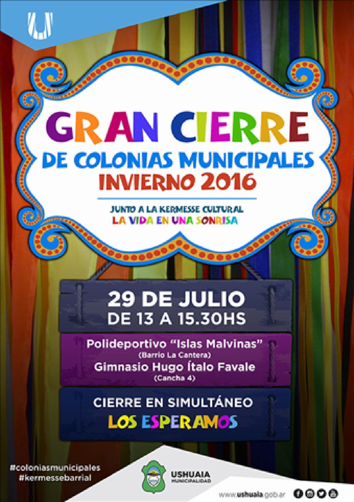 La Municipalidad de Ushuaia llevará adelante el cierre de las colonias de vacaciones de invierno. En este marco se realizarán actividades deportivas y recreativas el viernes 29 de julio desde las 13 hasta las 15.30 hs en el gimnasio de ‘Islas Malvinas’ ubicado -en el barrio La Cantera- y en la cancha Nº 4 del gimnasio ‘Hugo ítalo Favale’.