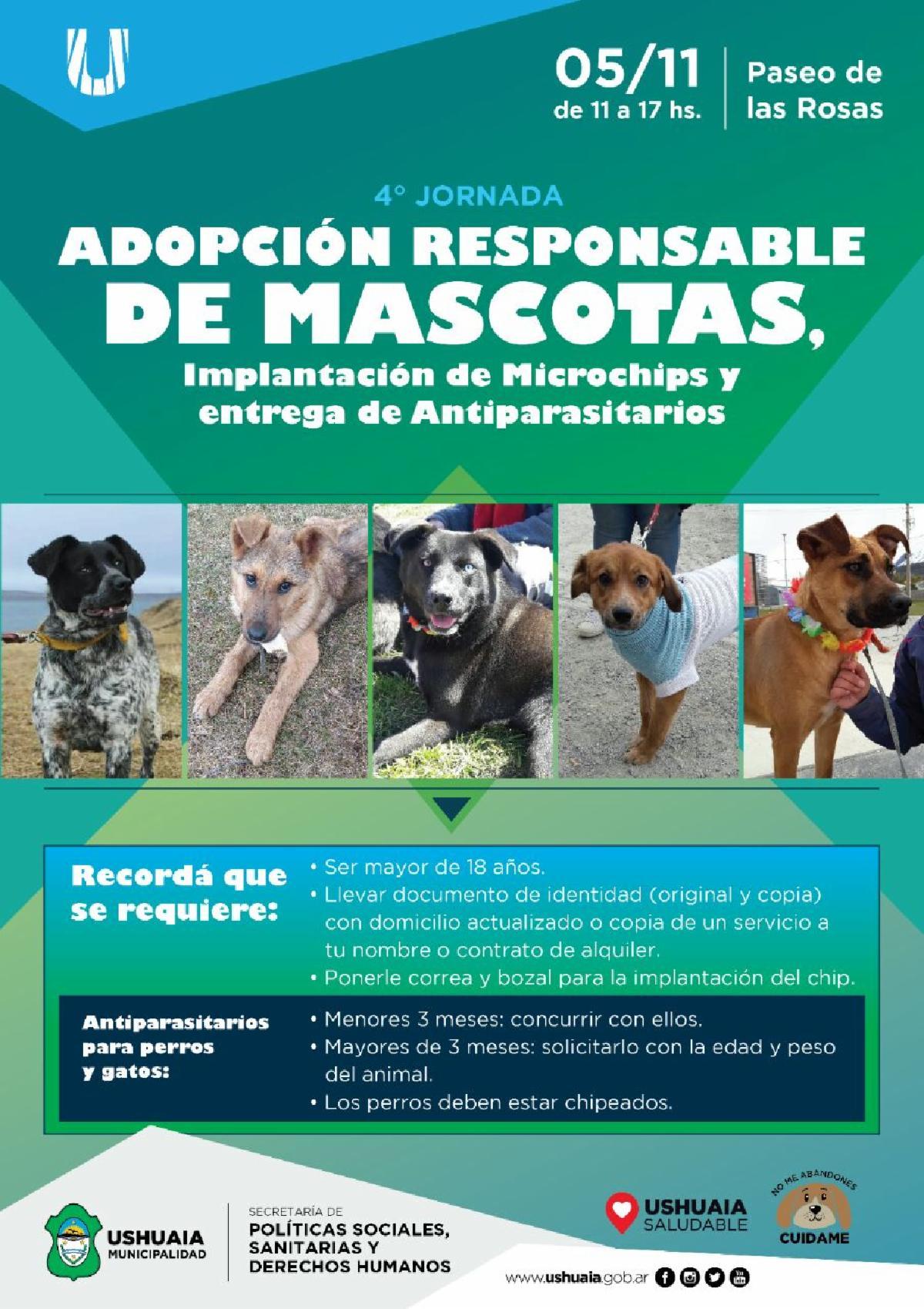 Allí se realizará la implantación de microchips en canes a partir de los tres meses de edad, adopción responsable de canes de los caniles municipales, entrega de antiparasitarios para perros con chip (excluyente) y la entrega de antiparasitarios para gatos. Se recuerda que para la implantación de los microchips, el propietario del can debe ser mayor de 18 años de edad, concurrir con documento de identidad (original y copia), con domicilio actualizado o agregar copia de servicio o contrato de alquiler. El can a registrar debe ir con collar y correa y además bozal en los casos de animales agresivos. Para la adopción responsable de canes de los caniles municipales, los interesados en adoptar también deben ser mayores de 18 años de edad y concurrir con DNI (original y copia) y domicilio actualizado. En tanto para la entrega de antiparasitarios para los perros con Chip, se pueden retirar los comprimidos de acuerdo al peso y edad del animal a partir de 3 meses. El propietario debe concurrir con copia del DNI. Si son cachorros menores a tres meses deberá concurrir con ellos para aplicar el antiparasitario en el lugar. Los antiparasitarios para gatos mayores de tres meses no es necesario llevarlos al lugar, hay que solicitar antiparasitario con el peso y la edad. TAMBIÉN HABRÁUN STAND EN LA FERIA DEL LIBRO En el marco de la XXII Feria del libro a llevarse a cabo el 3 de noviembre del corriente año en la Escuela N° 13, sita en Gobernador Paz 1811, la Subsecretaría de Políticas Sanitarias de la Municipalidad de Ushuaia, a través de la Dirección Municipal de Zoonosis y la Dirección de Municipios Saludables, estará presente con un stand de la campaña de sensibilización en Tenencia Responsable de Mascotas y prevención de mordeduras "Can-viviendo en Ushuaia", en el horario de 9:00 a 20:00 horas. En el Playón de estacionamiento de la Escuela Nro. 13, estará el quirófano móvil, en el horario de 09:00 a 17:00 horas con los siguientes servicios gratuitos ofrecidos: Implantación de microchip en canes a partir de los tres meses de edad; entrega de antiparasitarios para perros con chip (excluyente) y la entrega de antiparasitarios para gatos.