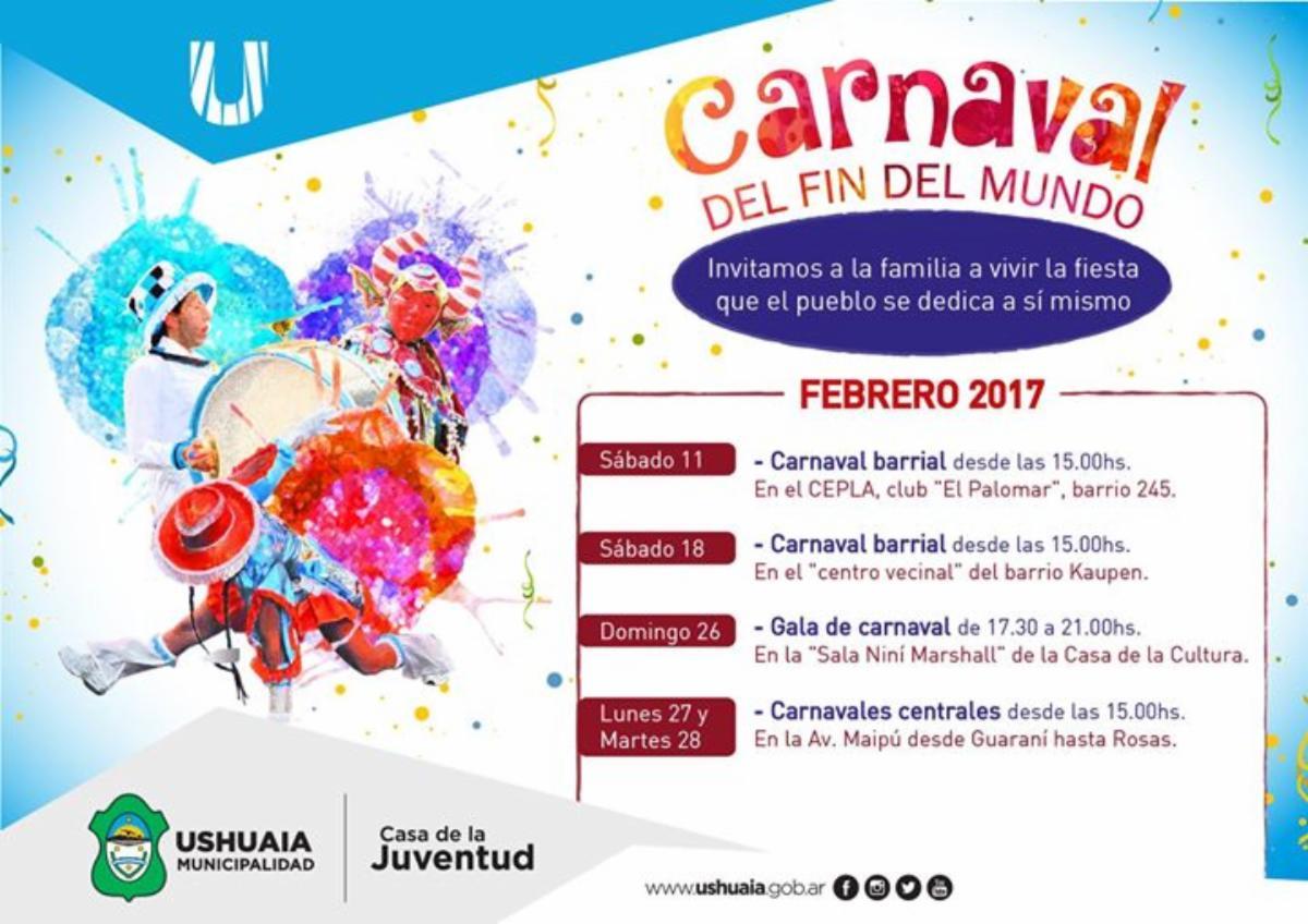 La primera fiesta tendrá lugar a las 15:00 horas en el CePLA, ubicado en el Barrio 245 Viviendas, donde una hora más tarde se presentarán los “Caporales Alegres de Bolivia”; 16.30 horas “Caporales Los Mineros”; a las 17:00 “Tobas Huayna Pacha”; 17.30 “Comparsa Anahí Piuken” y a las 18:00 cierra el “Corso Barrial”. El responsable del área contó que “desde el año pasado podemos apreciar el trabajo puntilloso de muchos jóvenes, donde además de venir a la Casa de la Juventud para organizarse y realizar las prácticas de rigor, estuvieron recibiendo capacitaciones de diferentes profesionales nacionales, entre ellos en ornamentación, samba y otros. Esto hace que la puesta en escena sea mucho más rica, porque fomentar este tipo de espacios garantiza que no es para pasar un tiempo sino para expresarse y saber transmitir de mejor manera”. Los carnavales se celebrarán durante varios fines de semana, de modo que para el sábado 18 de febrero están previstos los festejos en el Barrio Kaupén. A las 15.30 en el Centro Vecinal se realizará la concentración de vecinos para comenzar media hora después con los “Tobas Chunchos”; a las 16.30 “Supremacía Caporal”; 17:00 horas “Caporal Juventud Ushuaia”; a las 17.30 hs “Murga Estrella del Sur” y a las 18 horas “Cierre del Corso Barrial”. Cabe mencionar que la gala central será el 26 en la sala Niní Marshall de 17.30 a las 21:00 horas y el cierre de los Carnavales en Ushuaia será con un desfile en la doble jornada del 27 y 28, a las 15:00 horas sobre la Avenida Maipú, desde Guaraní hasta Juan Manuel de Rosas.