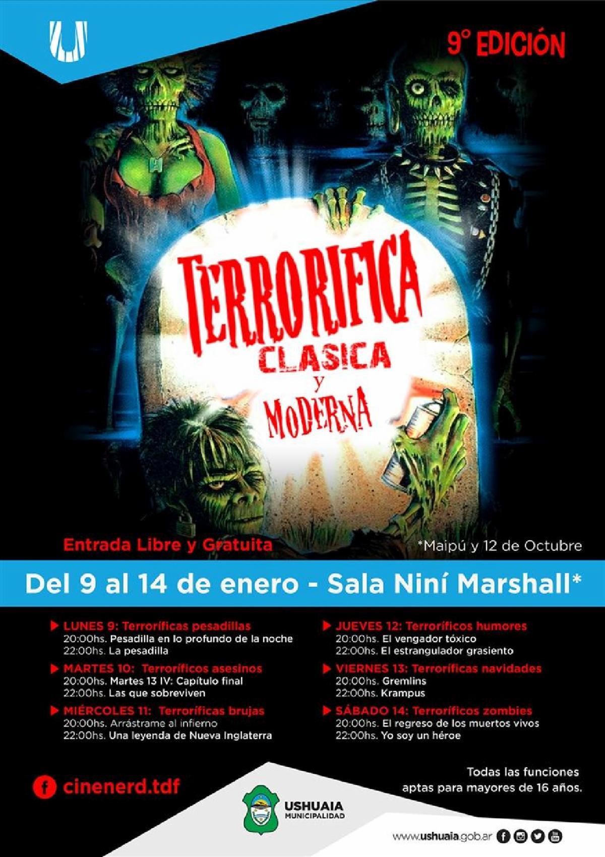 La secretaría de Cultura de la Municipalidad invita a la comunidad a participar desde el lunes 9 de hasta el sábado 14 de enero de la novena edición de “Terrorífica”, el ya clásico festival de cine bizarro, fantástico y de género organizado por el Cineclub Ushuaia. Será en la Sala “Niní Marshall” de la Casa de la Cultura.