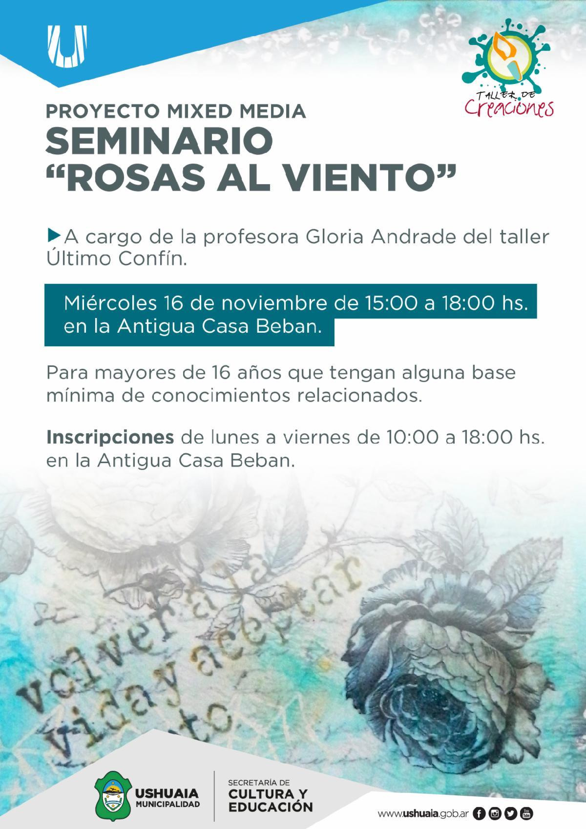 Este miércoles 16 de noviembre de 15 a 18 en la Antigua Casa Beban se dictará el seminario “Rosas al Viento”, a cargo de la profesora Gloria Andrade del taller Último Confín.