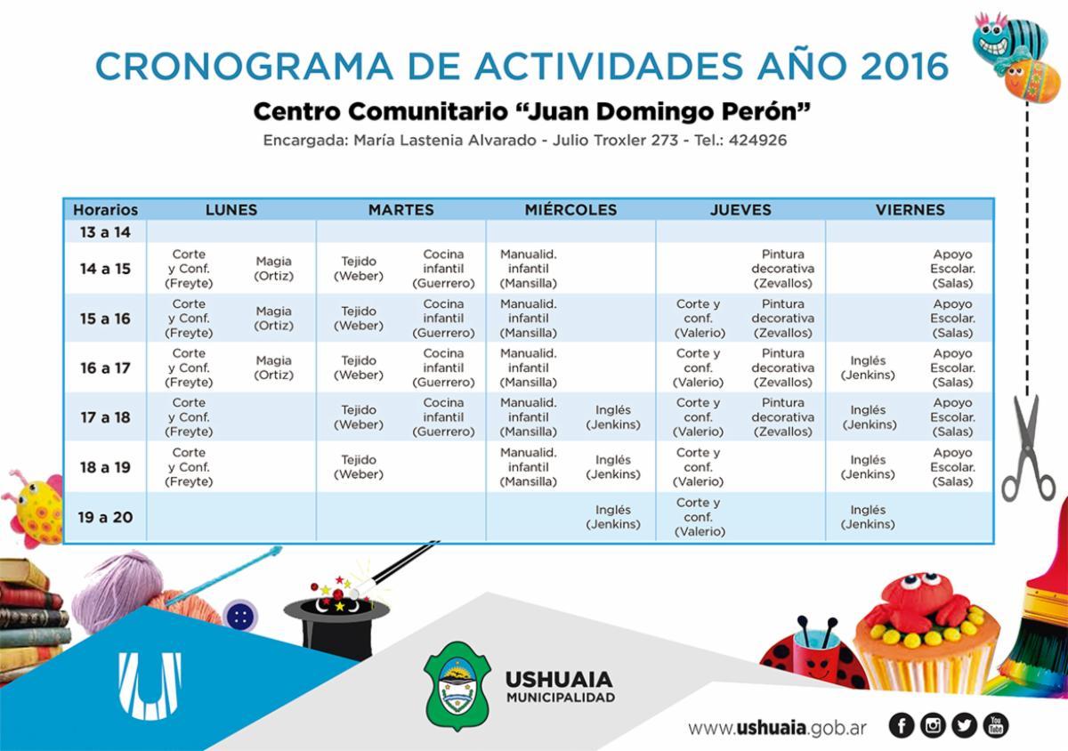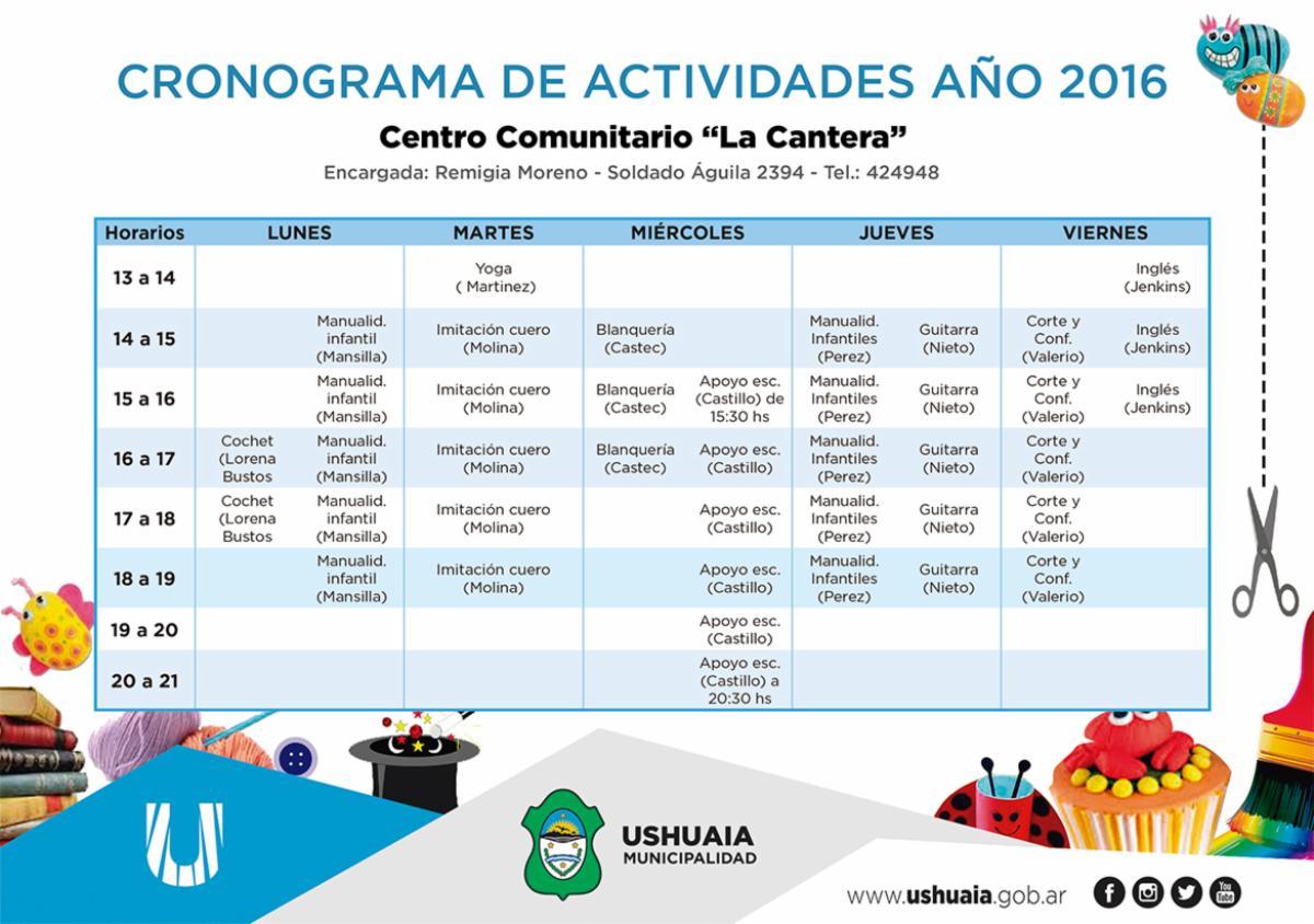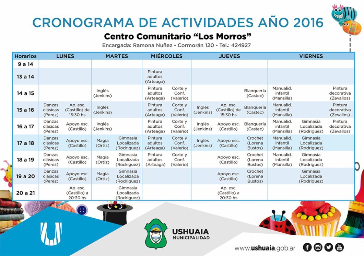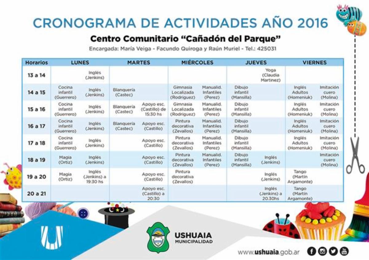La Municipalidad de Ushuaia invita a todos los vecinos a participar de las actividades que se llevan adelante en los diferentes centros comunitarios de la ciudad. Las actividades se realizarán de lunes a viernes en diferentes horarios. Para mayor información deberán acercarse al centro más cercano.