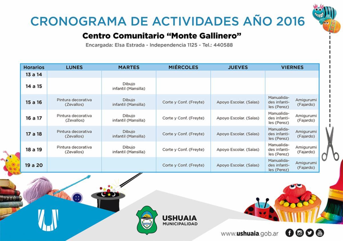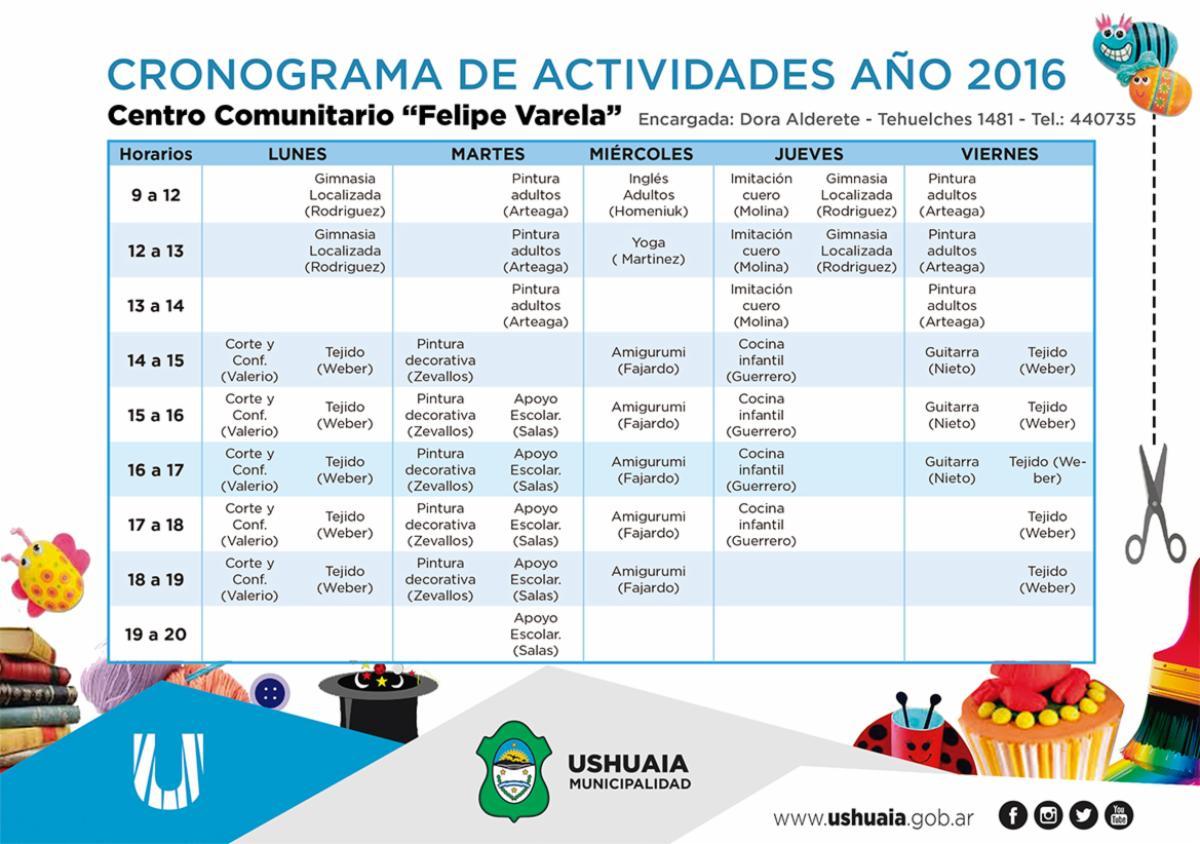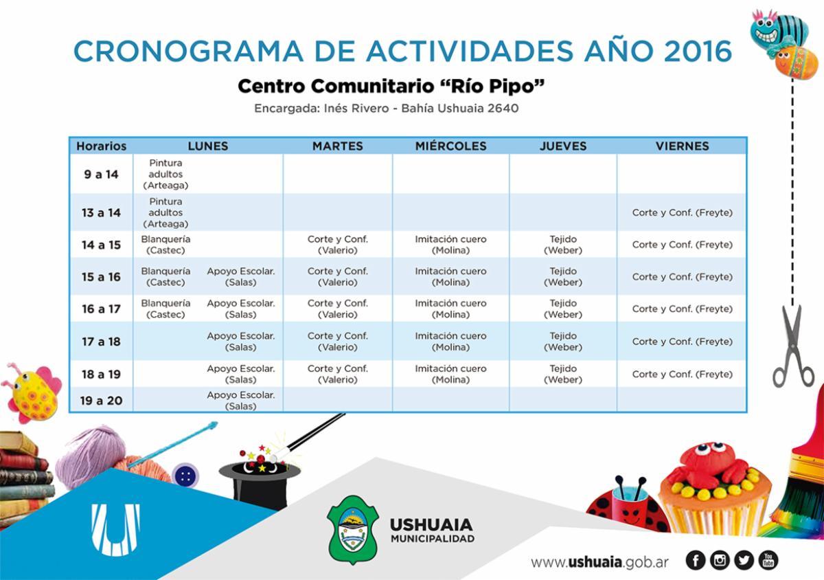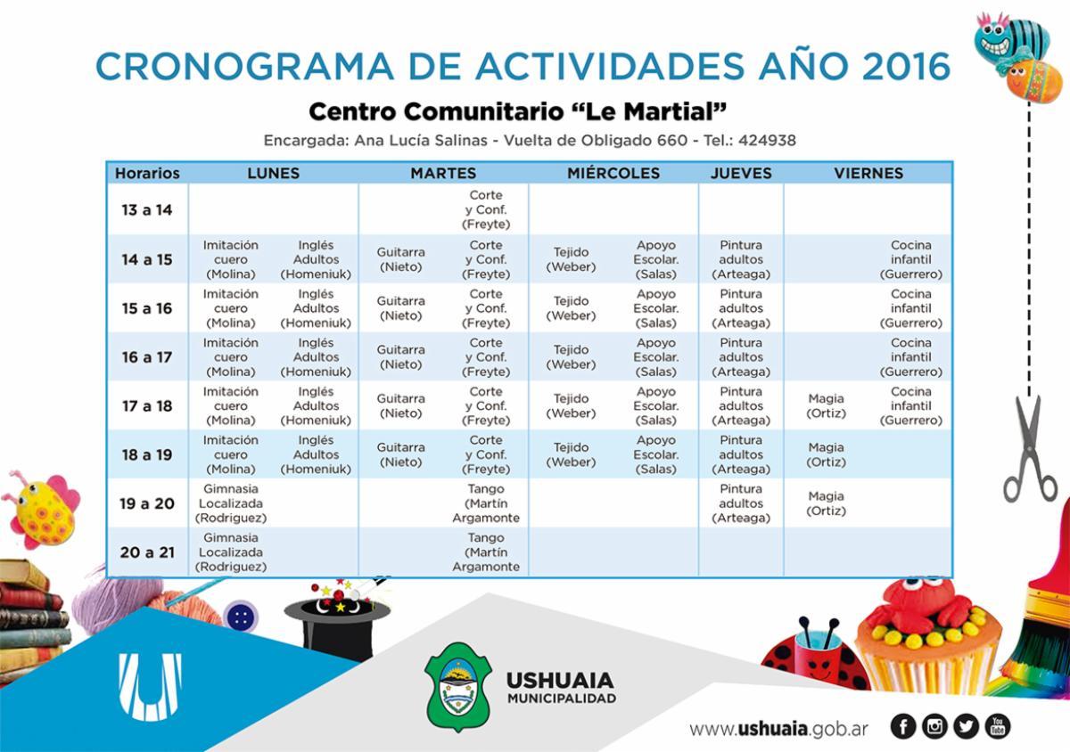 La Municipalidad de Ushuaia invita a todos los vecinos a participar de las actividades que se llevan adelante en los diferentes centros comunitarios de la ciudad. Las actividades se realizarán de lunes a viernes en diferentes horarios. Para mayor información deberán acercarse al centro más cercano.