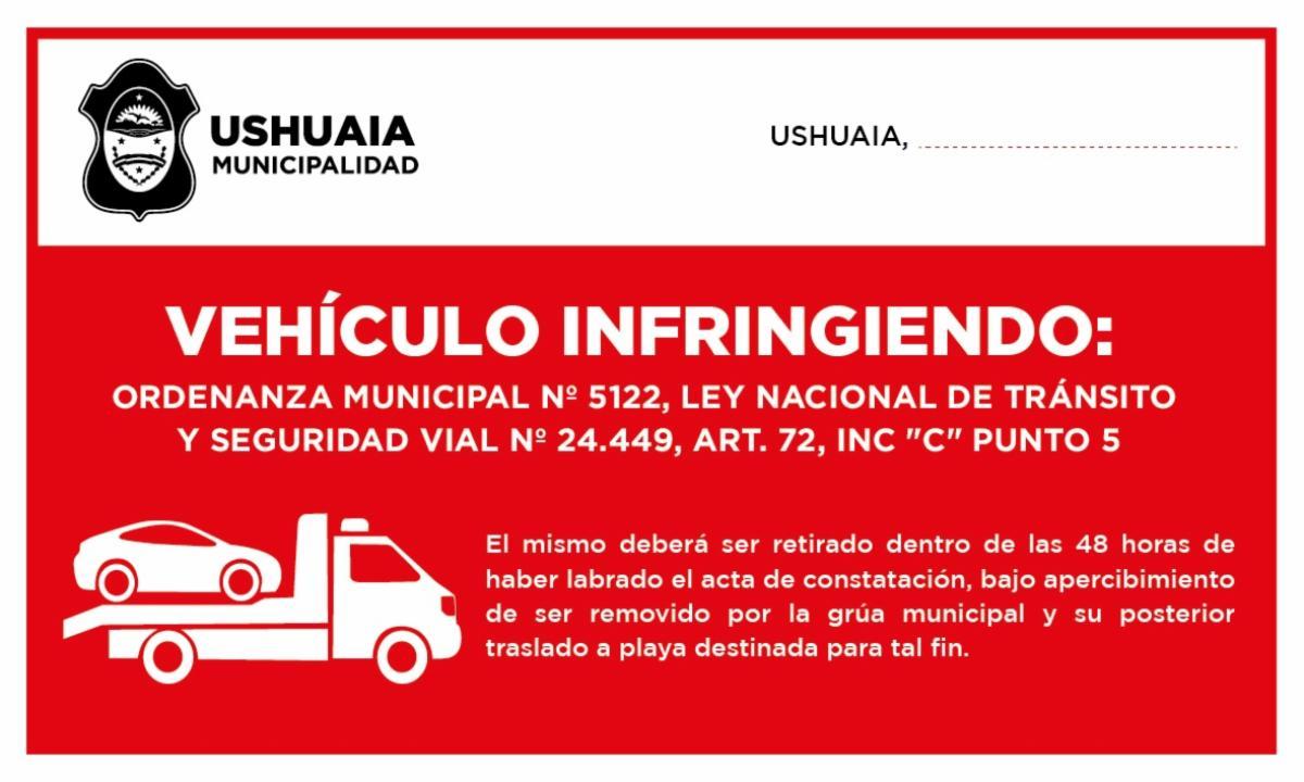En caso de que el vehículo sea infringido, se les colocará un cartel de aviso sobre el rodado en la que se informará que “el mismo deberá ser retirado dentro de las 48 horas de haber labrado el acta de constatación, bajo apercibimiento de ser removido por la grúa municipal y su posterior traslado a la playa de incautamiento”.