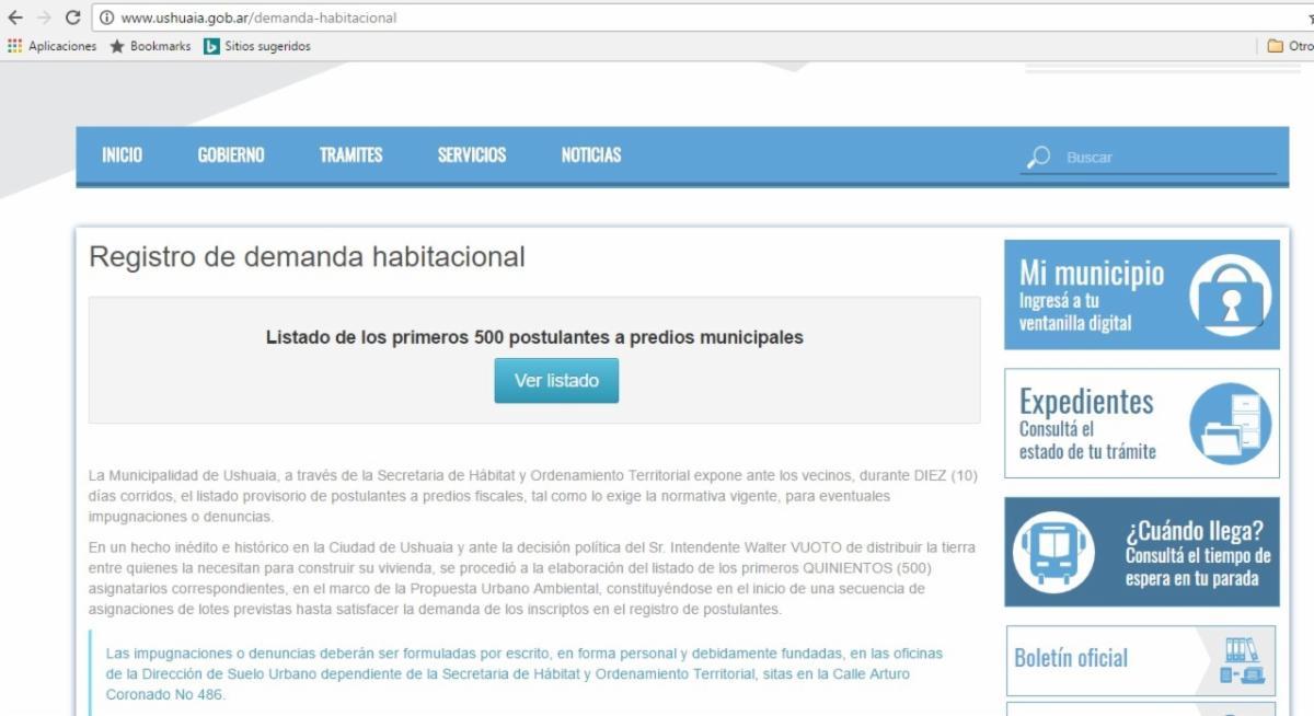 En la página oficial de la Municipalidad de Ushuaia, se encuentra publicado el listado de los primeros 500 postulantes a obtener su tierra y que surgieron del registro de demanda habitacional, luego del trabajo realizado desde la Secretaría de Hábitat y Ordenamiento Urbano y el tratamiento y aprobación de las ordenanzas de puntaje y de habilitación de espacios para nuevas urbanizaciones.