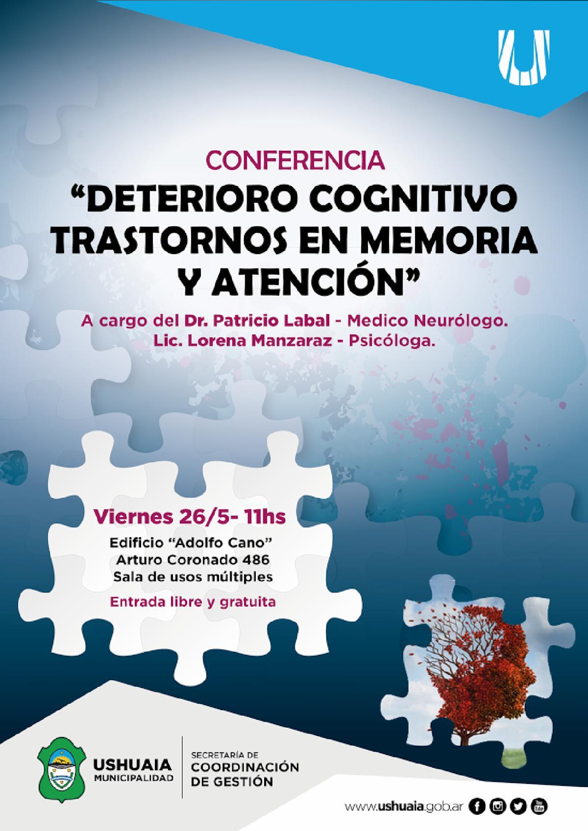 Con el propósito de brindar conocimientos y herramientas que permitan afrontar el deterioro cognitivo, la Municipalidad de Ushuaia invita a la comunidad en general a participar de la conferencia sobre “Deterioro cognitivo, trastornos en memoria y atención”, que se realizará el viernes 26 de mayo a las 11 en el aula de usos múltiples del edificio municipal Adolfo Cano.